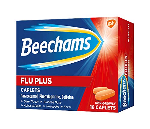 Paracetamol Phenylephrine Caffeine What are they for? Beechams Flu Plus Caplets provide relief from sinus pain and the symptoms of colds and flu, including fatigue and drowsiness Ingredients: Paracetamol 500 mg, Action: Painkiller and fever reducer, Relief of: Headache, sore throat, fever, aches & pains Ingredients: Caffeine 25 mg, Action: Mild stimulant, Relief of: Tiredness and fatigue Ingredients: Phenylephrine hydrochloride 5 mg, Action: Decongestant, Relief of: Blocked nose, painful sinuses.