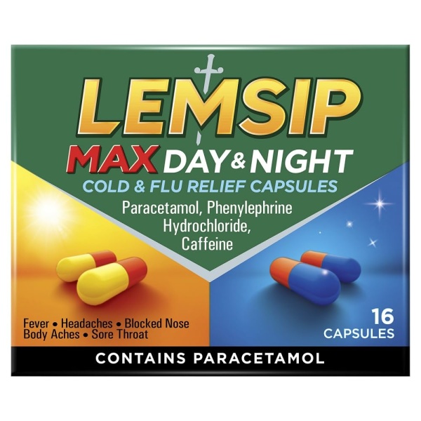 Lemsip Max Day & Night Cold & Flu Relief Capsules contains a combination of ingredients which are effective in relieving the symptoms associated with colds and flu, including relief of aches and pains, sore throats, headache, nasal congestion and lowering of temperature. In addition, the day capsules help relieve fatigue and drowsiness whilst the night capsules relieve the symptoms associated with nasal congestion to help allow sleep through relief of nasal congestion.