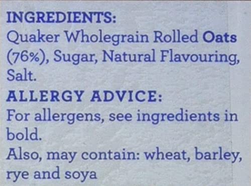 Quaker Wholegrain Rolled OATS (80%), Sugar, Natural Flavouring, Salt